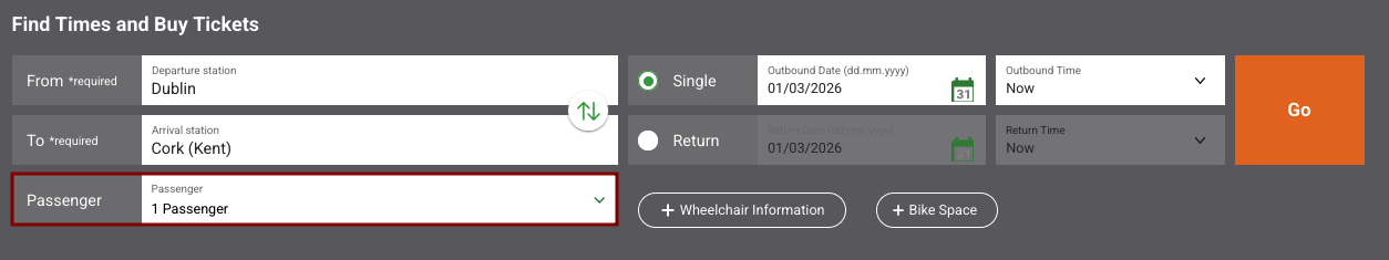 • First Class: Only available between Dublin and Cork during peak hours, also known as City Gold. First Class offers an onboard service and electronically adjustable seats. It cannot be used with FIP.1 As of March 2026, all services between Dublin and Cork except the following are operated with First Class2: